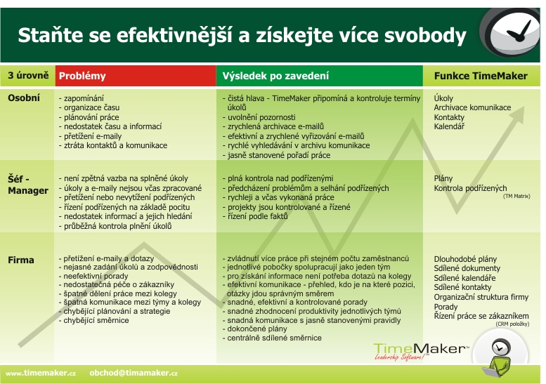 Jste firma z oblasti IT, Konzultanti? Staňte se autorizovanými partnery a pomozte svým klientům zvládat tyto problémové oblasti, kontaktujte nás na adrese obchod-zavinac- timemaker -tecka- cz nebo na cisle 775 260 000